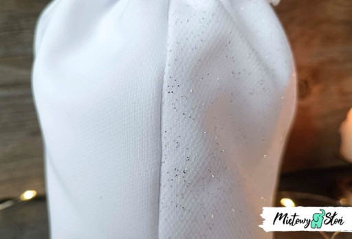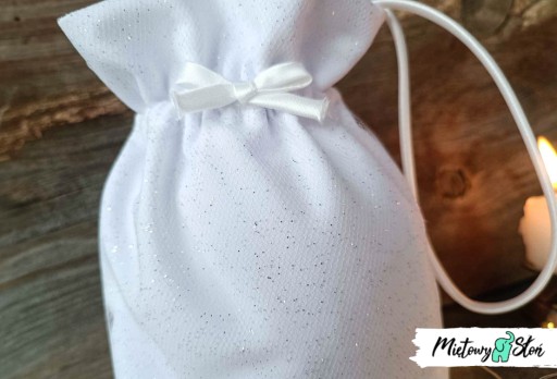 Torebka z BIAŁEJ tkaniny Barbie (tkanina poliestrowa na alby komunijne). Z przodu siatka brokatowa w kolorze srebrnym.