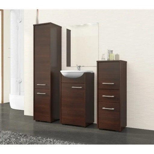 Optymalna szerokość i głębokość szafki sprawia, że nie będzie ona przeszkalała w poruszania się po łazience i w korzystaniu ze znajdujących się tam urządzeń. Konstrukcja szafki została wykonana z niezwykle wysokiej jakości płyty laminowanej.