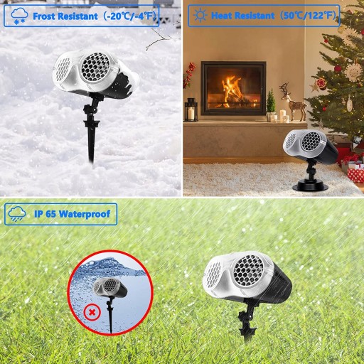Efekt żywych płatków śniegu: nasz projektor bożonarodzeniowy to ulepszona wersja efektu opadającego śniegu, który łączy "płatek śniegu" "opady śniegu" "obracające się białe plamy". Wzór nadaje żywym wrażeniem, które spadają prawdziwe śnieg, ciemne niebo i po prostu tworzy romantyczną atmosferę na Boże Narodzenie, urlop, wesele, przyjęcie itd.
