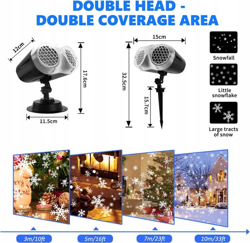 - Szerszy zasięg projekcji: projektor płatków śniegu wykorzystuje chip LED o większej mocy, aby oświetlenie było jaśniejsze i czystsze, o 30% większa jasność niż inne. Dzięki dwóm głowicom projekcyjnym ma większą powierzchnię pokrycia przy optymalnej odległości punktowej (5 m/22 m², 10 m/54 m²), może być używany tylko jednej lampie projektorowej prawie cały dom, ogród i tył. oświetlić podwórko.