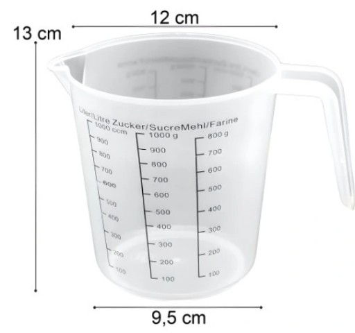 Miarka kuchenna o pojemności 1000ml jest wykonana z trwałych materiałów, takich jak tworzywo sztuczne i jest wyposażona w skalę oznaczeń po obu stronach w ccm (censtymetr sześcienny) oraz gramach, a także w uchwyt służący do trzymania jej w ręce.