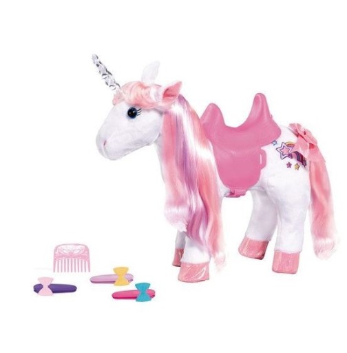 - Akcesoria w zestawie: Interaktywny, ruchomy jednorożec,ze świecącym rogiem (zmieniające się kolory) efekty dźwiękowe (m.in. dźwięki jednorożca - rżenie, urocze melodie) Zdejmowane, różowe siodło, Akcesoria do czesania i stylizacji: grzebień i 3 spinki do włosów.
