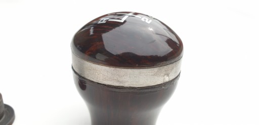 Gałka ala drewniana, w okleinie drewnopodobnej. Jak widać na zdjęciach ma małe poprawki w okolicach srebrnego oringu (zaznaczone czerwonymi strzałkami). W zestawie tulejka niezbędna do zamontowania gałki.