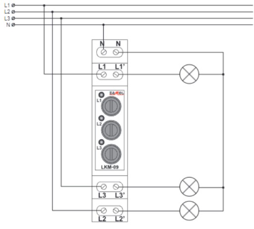 Moduł wskaźnika zasilania z zabezpieczeniem bezpiecznikowym LKM-09 przeznaczony jest do prezentacji obecności napięcia zasilającego na każdej z faz. Może być również zastosowany do zabezpieczenia odbiorników elektrycznych przed skutkami wzrostu prądu ponad dopuszczalną wartość, ograniczaną za pośrednictwem zastosowanych bezpieczników topikowych. Urządzenie doskonale sprawdzi się nawet w przypadku zabezpieczenia przedlicznikowego przekraczającego 25A. Uszkodzenie bezpiecznika topikowego spowoduje odcięcie odbiornika od napięcia zasilania i wygaszenie odpowiedniej diody LED dzięki czemu brak napięcia zasilania danej fazy będzie od razu widoczny. Ułatwia to diagnostykę wstępną stanu instalacji. Po usunieciu ewentualnej awarii i wymianie bezpiecznika na nowy – układ powraca do normalnej pracy. Należy pamiętać o maksymalnym prądzie zabezpieczenia nie przekraczającym 6A. W tej konfiguracji urządzenie może posłużyć jako dobezpieczenie aparatury kontrolno-pomiarowej, np. sekcji przekaźników bistabilnych, sterowników rolet lub też monitora energii MEW-21. Po usunięciu bezpiecznika urządzenie zapewnia widoczną przerwę w obwodzie.