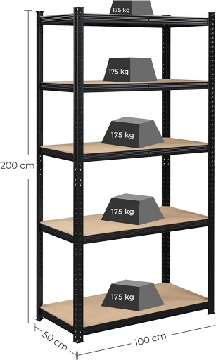 [wytrzymały i stabilny] Ten regał garażowy ma stalową ramę, a każdy poziom może utrzymać obciążenie do 120 kg. Dołączony zestaw zabezpieczający przed przewróceniem ułatwia przymocowanie regału do ściany, dzięki czemu jest on bardziej stabilny i bezpieczny [podzielny] Ten metalowy regał można podzielić na 2 oddzielne jednostki, aby dopasować je do potrzeb przechowywania i dostępnej przestrzeni; po podzieleniu świetnie sprawdzają się również jako stoły warsztatowe z miejscem do przechowywania [regulowane półki] Każdy poziom można łatwo regulować co 5 cm, spełniając potrzeby przechowywania przedmiotów o różnych rozmiarach [duży rozmiar, duża pojemność] Dzięki wymiarom 50 x 100 x 200 cm i całkowitej nośności 600 kg ten regał może być używany w garażu, magazynie, piwnicy lub pomieszczeniu gospodarczym do uporządkowania wszystkich narzędzi i sprzętu [łatwy montaż bez użycia narzędzi] Dzięki blokującej konstrukcji i przejrzystym instrukcjom ten wytrzymały regał jest łatwy w montażu i nie wymaga żadnych narzędzi Dane techniczne:- kolor: czarny- materiał: stalowa rama, płyta mdf (płyta pilśniowa o średniej gęstości)- rozmiar produktu: 200 x 100 x 50 cm (wys. X dł. X szer.) - waga produktu: 16,8 kg - max. Nośność statyczna na poziom: 175 kg zawartość opakowania: - 1 x regał - 1 x zestaw zabezpieczający przed przewróceniem - 1 x instrukcja
