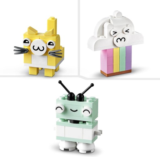 Ten kreatywny zestaw konstrukcyjny zawiera 333 klocki o różnych kształtach, rozmiarach i pastelowych kolorach. 18 klocków ma oczy, dzięki którym dzieci mogą ożywić swoje dzieła. W zestawie są czytelne, drukowane instrukcje budowania dla pięciu łatwych do złożenia modeli: chmurki, lodów, dinozaura, kota i robota. Wraz ze wzrostem pewności siebie dzieci mogą odkrywać niekończącą się zabawę w budowanie. Cyfrową wersję instrukcji można również znaleźć w aplikacji LEGO Builder.