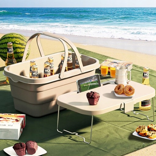 Po pierwsze, jest to składany kosz piknikowy z pokrywą; Po drugie, pokrywa zestawu kosza piknikowego może być używana jako mały stolik, jest na nim miejsce na kubek i telefon komórkowy, możesz oglądać ulubione filmy lub wideo podczas pikniku; Może być również używany jako schowek lub napełniony wodą jako wiadro do schłodzonych napojów lub mycia owoców.