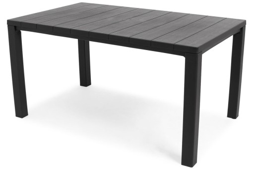 Duży prostokątny stół o wymiarach: 147 x 90 x 74,5 cm swobodnie pomieści 6 osób. Blat ma delikatną fakturę przypominająca drewniane panele, a nogi są stabilne i zakończone antypoślizgowo.