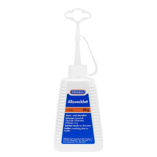 Smar wielozadaniowy 80 g-D marki PRESSOL. Do powieszenia i odstawienia. Szczelne dzięki zabezpieczającemu przed wypływem kołpakowi zamykającemu. Możliwe jest dokładne dozowanie. Jednostka opakowaniowa w kartonie ozdobnym promującym sprzedaż. Bezżywiczny i bezkwasowy. Trwale smaruje gwinty, zawiasy i zamki. Chroni metale przed korozją. Łączy niezawodnie, nie kapie.