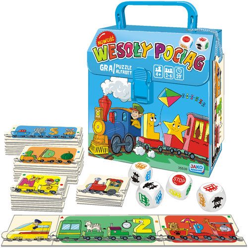 Gra Wesoły pociąg dzięki prostym zasadom jest odpowiednia dla przedszkolaka, wciągnie także dorosłego gracza. To gwarancja udanej zabawy dla wszystkich, bez względu na wiek. Wybierzcie swoje lokomotywy, parowe ciuchcie lub szybkie elektrowozy. Rzucając kostkami, zdobywajcie wesołe wagoniki i budujcie swoje pociągi. Gracz, który będzie mieć najwięcej wagonów (punktów), wygrywa. W wariancie zaawansowanym wykażcie się znajomością alfabetu i zdobywajcie dodatkowe punkty.