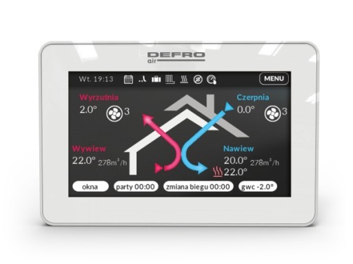 - Nowoczesna Kontrola: Dotykowy panel sterujący Defro Air w cenie rekuperatora oraz możliwość rozbudowy o moduł komunikacji internetowej.