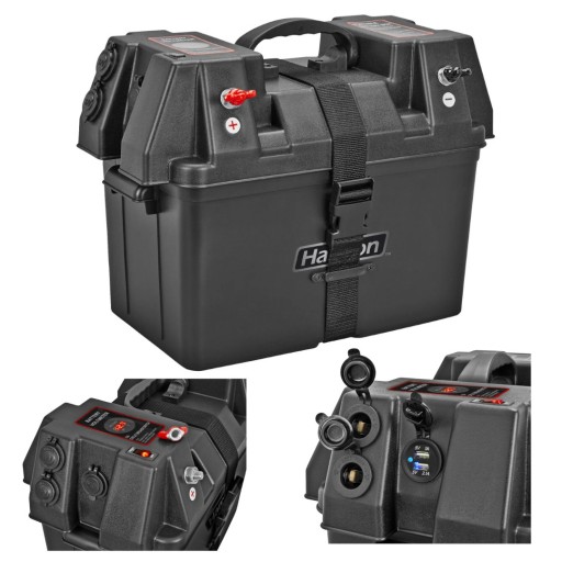 Wytrzymała skrzynka na akumulator z uchwytem do przenoszenia została wykonana z kwasoodpornego tworzywa polipropylenowego, a ponadto jest wyposażona w gniazda USB i 12 V.