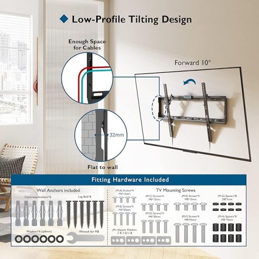 Oszczędność miejsca: ten płaski uchwyt ścienny TV mierzy tylko 33 mm od ściany, aby zaoszczędzić miejsce w salonie i zapewnić schludny wygląd. Uchwyt ten można odchylić o 10 stopni w dół, aby uzyskać najlepsze wrażenia podczas oglądania i poprawić zdrowie poprzez zmniejszenie odblasków oraz zmęczenia szyi i oczu.