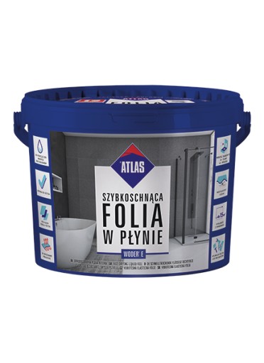 - ATLAS SZYBKOSCHNĄCA FOLA W PŁYNIE WODER E produkowana jest w postaci gotowej do użycia masy na bazie dyspersji polimerowych, wypełniaczy oraz środków modyfikujących.