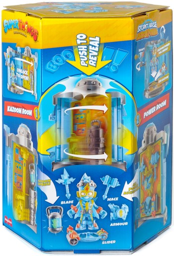 Odkryj sekretną kryjówkę Kazoom Power! Tylko wtedy, gdy jesteś sojusznikiem, będziesz mógł wejść do ich bazy. Z zewnątrz kamera skanuje twarz odwiedzającego. Jeśli jest złoczyńcą, celny strzał zakończy jego pragnienie węszenia! Po wejściu do środka znajdziesz energię Kazoom i możesz uzyskać dostęp do tajnej strefy, aby zdobyć ukrytą broń, zbroję i super pojazd skateboardowy do obrony miasta! Zawartość: 1 tajna baza, 1 Kazoom Kid ekskluzywny Kazoom Power Full Energy, 1 SuperThing ekskluzywny Kid Kazoom, 1 pojazd - łyżwy