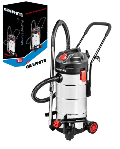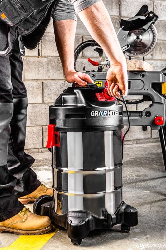 Wysokiej klasy odkurzacz warsztatowy GRAPHITE z silnikiem o mocy 1500 W, przeznaczony do szybkiego i skutecznego usuwania urobku po pracach warsztatowych.