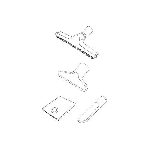 W zestawie z odkurzaczem znajdują się także: wąż ssący, końcówki robocze, rura teleskopowa, worek na pył, membrana piankowa, filtr, zaczepy przewodu zasilającego i adapter, śruby wraz z nakrętkami specjalnymi oraz wkręty.