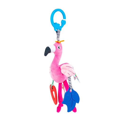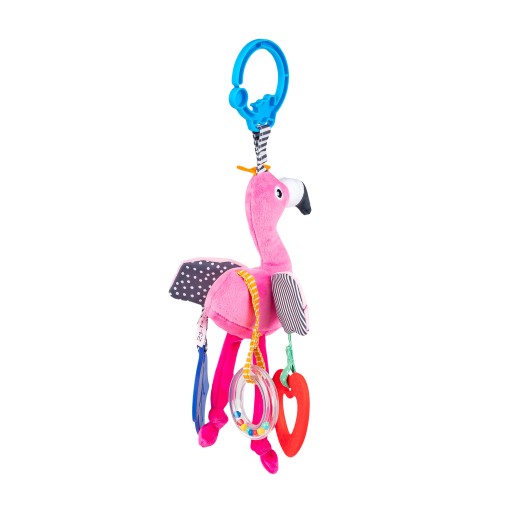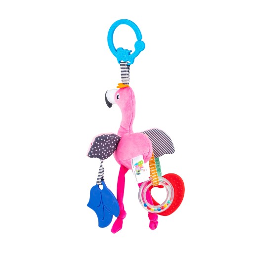 Rajskie klimaty na wyciągnięcie dziecięcej rączki! Kolorowy flaming rozweseli bobaska, zapewniając mu rozrywkę. Skrzydełka ptaszka zdobią dodatkowe zabawki, w postaci dwóch, kolorowych i miękkich gryzaczków. Do zabawki doczepiona jest także grzechocąca obręcz, wypełniona kolorowymi kuleczkami. Flaming uszyty został z materiałów o zróżnicowanych fakturach, dzięki czemu stymuluje zmysł dotyku malucha, zachęcając go do sensorycznego poznawania świata. Praktyczny uchwyt, w który wyposażona została zawieszka, umożliwia łatwe przymocowanie zabawki w dowolnym miejscu.Produkt przeznaczony jest dla dzieci od dnia narodzin.Cechy produktu:kompaktowy rozmiar,zróżnicowane materiały,szeleszczące skrzydełka,gryzaki,grzechotka,praktyczna zawieszka do przymocowania w wybranych miejscu,wiek: 0m+.