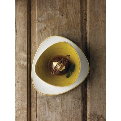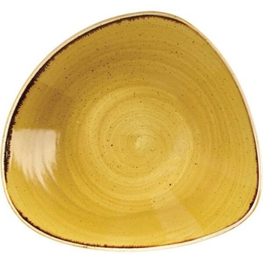 Porcelanowa salaterka o trójkątnym kształcie i średnicy 24,8 cm, z serii Stonecast, w kolorze Mustard Seed Yellow marki Churchill. Seria Mustard Seed Yellow Stonecast to porcelana w ciepłym, żółtym odcieniu, zdobiona ręcznie nakrapianym wzorem, z brązowym (jaśniejszym lub ciemniejszym) rantem.