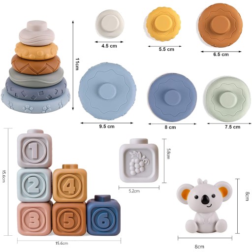▶️ Uroczy miś koala - dołączony do zestawu miękki miś może stanowić zwieńczenie wieży z klocków lub piramidy z krążków. Można go wykorzystać jako samodzielną zabawkę lub gryzka dla niemowlaka.