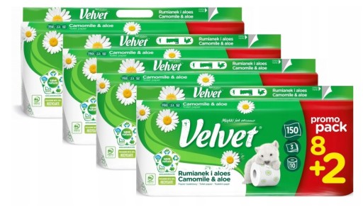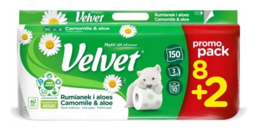 Papier toaletowy Velvet Rumianek i Aloes, wykonany z trzech warstw delikatnej bibułki, jest miękki i ma łagodny, inspirowany naturą zapach. Dzięki eleganckim tłoczeniom oraz nadrukowi stanowi też idealną dekorację Twojej łazienki.