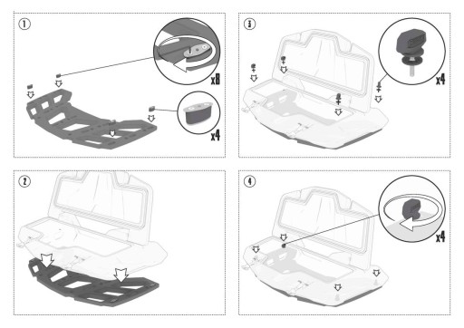 Kufer wyposażony jest w szybkozłącza (w zestawie), które są instalowane w oryginalnych otworach bagażnika.