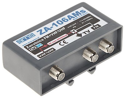 Zwrotnica antenowa ZA-106AMS z 2 wejściami stosowana jest jako element sumujący sygnały z 2 anten (sygnały pasma FM (87..110 MHz), oraz pasma VHF+UHF (174..694 MHz)), montowana jest na maszcie antenowym, w pobliżu zestawu antenowego Posiada dodatkowy filtr ograniczający pasmo UHF powyżej 700 MHz ZA-106AMS umożliwia przesłanie zasilania DC max. 24V/250mA do zasilenia wzmacniacza montowanego w puszce anteny (zasilanie możliwe jest w gałęzi VHF/UHF)