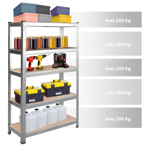 Regał składa się z 5 półek, na których możesz ułożyć produkty, kartony, czy też urządzenia maksymalnie obciążając każdą półkę aż do 200 kg.