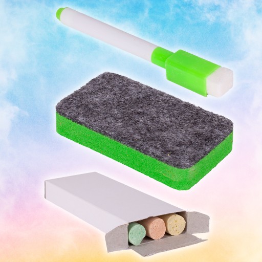 Tablica ma zarówno stronę na której można pisać zwykłą kredą, jak i stronę suchościeralną, co umożliwia rysowanie bez żadnych kartek.