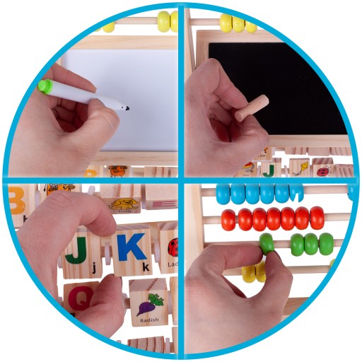 Na czterech szczebelkach zabawki znajdują się drewniane klocki, które z dwóch stron oznakowane są albo liczbami albo literami alfabetu lub obrazkami ukazującymi zwierzęta czy też owoce. Ta część zabawki wpływa na rozwój intelektualny dziecka. Pozwala mu poznawać pierwsze litery, cyfry czy kształty.