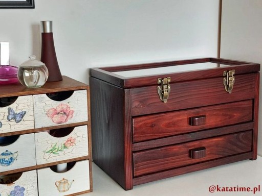 Elegancka i funkcjonalna, w całości ręcznie robiona, piękna skrzyneczka ze starego, długo sezonowanego, przepięknego, kolorowego drewna dębowego, do przechowywania 24 sztuk zegarków. Wykonanie ze starego, pełnego drewna, ze znakami starości, szlifowanego i lakierowanego. Ta skrzyneczka posłuży lata. Solidne zawiasy i zapięcie idealnie pasują do rustykalnego stylu całości. Kieszonki na zegarki są duże i głębokie, świetnie zabezpieczają zegarki przed uszkodzeniem oraz porysowaniem przez np. koronkę sąsiada, wygodnie zmieszczą się zegarki o szerokości nawet 55 mm! Szkło w wieczku skrzyneczki jest grube, hartowane dzięki czemu ma podniesioną odporność na stłuczenia i porysowanie. Warto popatrzeć na szczegóły wykonania. Pudełko jest podklejone filcem.