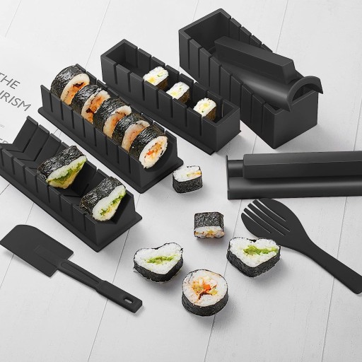 Zestaw zawiera 17 niezbędnych elementów, aby stworzyć wyjątkowe sushi w domu. Znajdziesz w nim m.in. mata bambusowa do zwijania, pałeczki, nóż łopatkę oraz specjalną formę do ryżu.