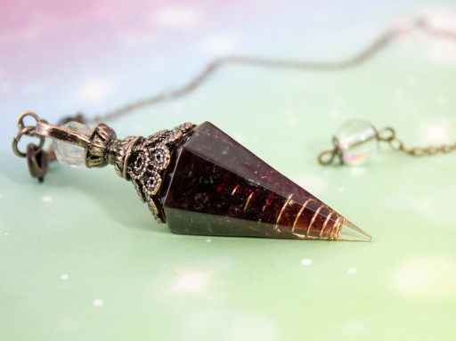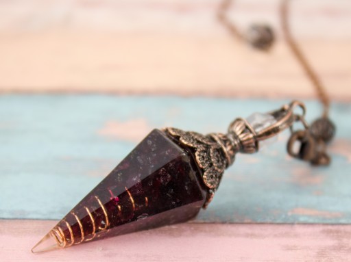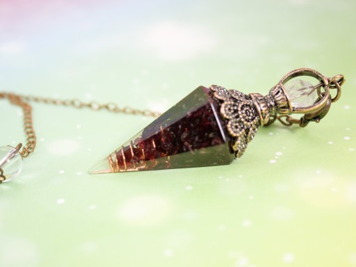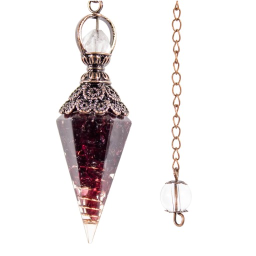 Wahadełko orgonitowe z granatem i czystą miedzią- kamień pewności siebie i odwagi, który pomaga przezwyciężyć nieśmiałość i podejmować trudne decyzje w życiu.