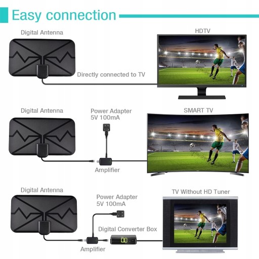 1. 1. Setki bezpłatnych kanałów: Nowa generacja anten pozwala pozbyć się wysokich kosztów oglądania telewizji cyfrowej. Antena jest kompatybilna z konwerterami telewizyjnymi i setkami telewizorów telewizji cyfrowej/4K UHD (4K UHD), takich jak telewizory dla ABC, dla CBS, dla NBC, dla PBC, dla Fox. Dlatego aktualizuj lokalne programy na żywo bez konieczności wydawania dodatkowych pieniędzy lub utraty ulubionych lokalnych kanałów telewizyjnych z najlepszą jakością odbioru.