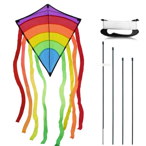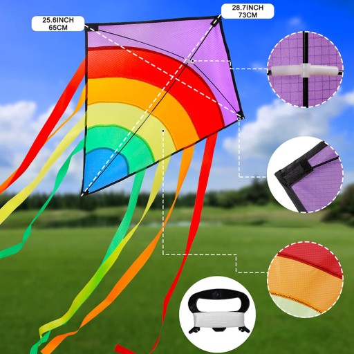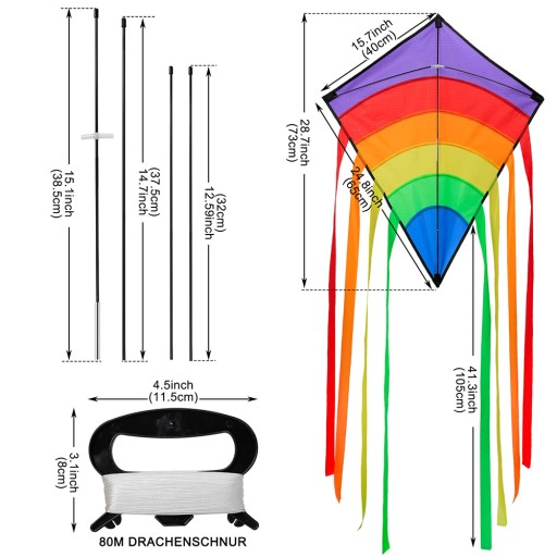 - 🌈 - 【Kolorowy latawiec】: tęczowy latawiec ma wymiary 73 x 65 cm z 8 pasującymi kolorowymi ogonami o długości 105 cm i linką latawca o długości 80 m. Łatwy w montażu, idealny dla początkujących. Kolorowy design sprawia, że latawiec jest wyraźnie widoczny z dużej wysokości. Fascynujący moment, w którym latawiec wznosi się w powietrze, pozostaje niezapomniany dla dzieci