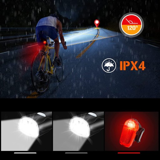 - IPX4 wodoodporne, światła rowerowe zapewniają dobrą widoczność nawet w deszczu lub innej złej pogodzie, możesz cieszyć się bezpieczną nocną jazdą.