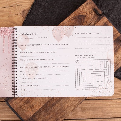 - skład: księga gości na 18 urodziny, która posiada wewnątrz ankiety przygotowane specjalnie na tę okazję, a także wykropkowane miejsca na wpisanie indywidualnych życzeń gości, karty księgi umieszczone są na spirali, okładka jest laminowana - księga prezentuje się przepięknie i stanowi imprezowy hit