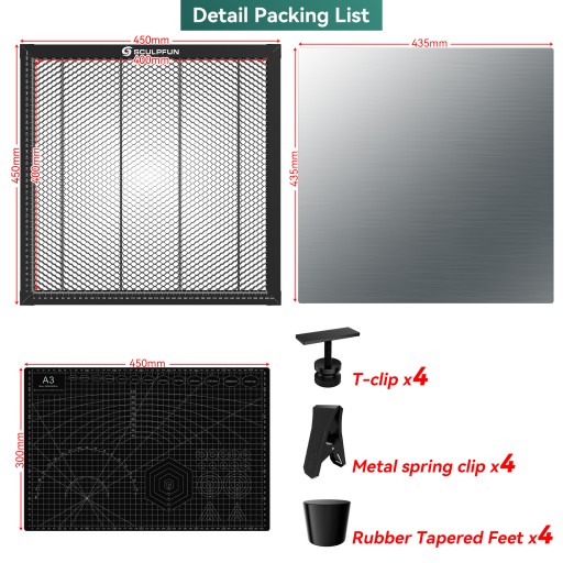 5. Metalowa płyta ochronna na biurko: Panel o strukturze plastra miodu SCULPFUN jest wyposażony w metalową płytkę ochronną na biurko, która może chronić pulpit przed uszkodzeniem laserem, idealna do małych laserów diodowych DIY.