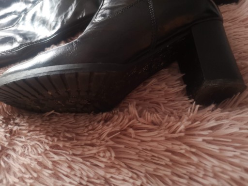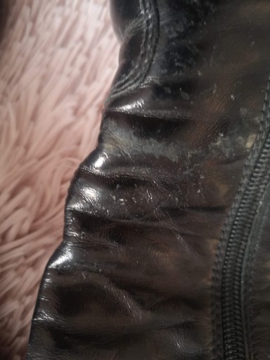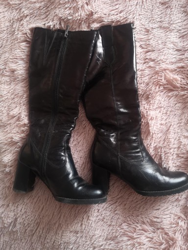 Rozmiar 35. Długość cholewki 29 cm. Długość wkładki 23 cm. Szerokość cholewki na samej górze 17 cm. Gdzieniegdzie są niewielkie przetarcia. Skórzane, lakierowane.