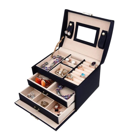 ⭐ Bardzo funkcjonalna szkatułka na biżuterię z licznymi przegródkami. Kuferek jest niezwykle praktyczny, można w nim uporządkować bardzo dużą ilość biżuterii i ochronić ją przed zniszczeniem. Znajduje się w nim miejsce na pierścionki, kolczyki, a także naszyjniki i zegarki.
