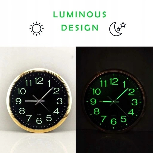 Glow in The Dark - cyfry i wskazówki, które mają funkcję oświetlenia nocnego. Prosi o wchłonięcie wystarczającej ilości energii świetlnej w ciągu dnia. W nocy jest emitowany w sposób fluorescencyjny, dzięki czemu można zobaczyć światło w nocy lub w ciemności. (Wskazówki: zegar ścienny będzie świecił w ciemności przez około 5-6 godzin, czas świecenia zależy od światła wchłonięty w ciągu dnia)