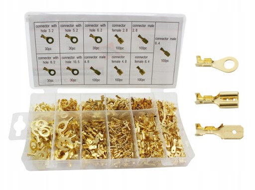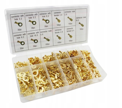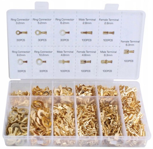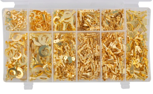 Końcówki kablowe służą do łączenia kabli z urządzeniami elektrycznymi, innymi kablami, powierzchniami, itp. Zestaw zapakowany jest w pudełko plastikowe, posegregowane rozmiarami.
