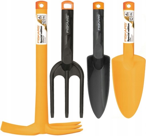 Profesjonalny zestaw markowych narzędzi ogrodowych FISKARS. Zestaw do pielęgnacji małych roślin (zarówno doniczkowych, jak i rabatowych) oraz spulchniania gleby w ogrodach.