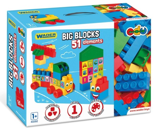 Big Blocks to zestaw dużych kolorowych klocków, które dostarczą nieograniczone możliwości zabawy dla każdego miłośnika tworzenia budowli z klocków . W zestawie znajduje się 51 elementów klocków o różnych kształtach i kolorach, co daje wiele możliwości podczas budowania, oraz zestaw kolorowych naklejek do przyozdobienia budowli. Arkusz naklejek zawiera cyfry, literki, postacie, owoce, warzywa, zwierzęta i wiele innych ciekawych obrazków. Klocki Big Blocks wyróżnia bardzo łatwy system montażu oraz rozmiar idealnie dostosowany do rączek najmłodszych dzieci. Różnorodność form umożliwia tworzenie z klocków rozmaitych budowli, pojazdów i postaci rozwijając w dziecku wyobraźnię i twórcze myślenie.