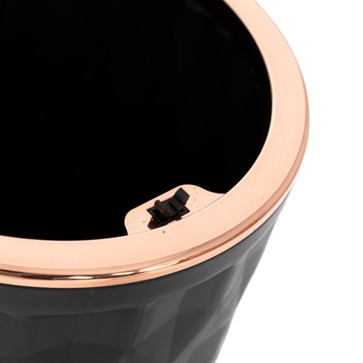 Kosz na śmieci DEMI to doskonałe wyposażenie pokoju, łazienki lub sypialni. Wykonany z jakościowego tworzywa jest lekki i łatwy do utrzymania w czystości, a jego korpus pokrywają ozdobne tłoczenia w kształcie geometrycznych wzorów. Kosz zamykany jest pokrywą, która pozwala zachować mu schludny wygląd i zatrzymuje zapachy wewnątrz pojemnika. Aby ją otworzyć, wystarczy nacisnąć oznaczony punkt.