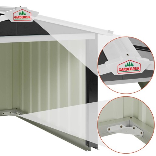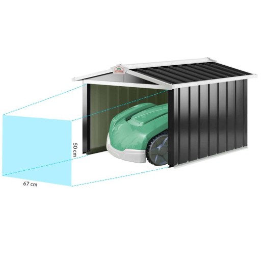 Garaż jest trwałym domem dzięki wysokiej jakości ocynkowanej ogniowo blachy stalowej i ocynkowanej stalowej ramy pokrytej lakierem chroniącym przed promieniowaniem UV. Trapezoidalny kształt metalowych płyt zapewnia optymalną stabilność ściany. Dodatkowe listwy przypodłogowe, metalowe wsporniki i 4 solidne kołki zwiększają stabilność i chronią garaż przed wiatrem. Dzięki wysokiej jakości ocynku schron jest niezwykle odporny na zimno i rdzę. Pomysłowa prowadnica na przewód lądujący z gumową osłoną pozwala wygodnie wyprowadzić przewód z garażu. Do montażu altany odpowiednie są równe powierzchnie typu trawnik, fundamenty betonowe, nawierzchnie brukowane lub odkryte płyty betonowe. Osłonę na kosiarkę można przymocować do twardych powierzchni za pomocą kotew gruntowych. Powierzchnia przechowywania wynosi 76,5 x 85 cm –wymiary pozwalają na przechowywanie komercyjnych kosiarek zautomatyzowanych. Dzięki dużemu dostępowi kosiarka zautomatyzowana może bezpiecznie zadokować w stacji ładującej.