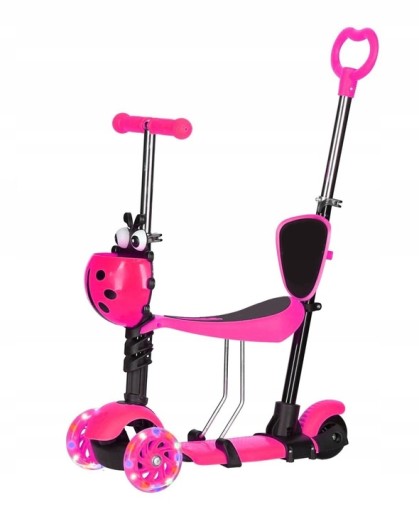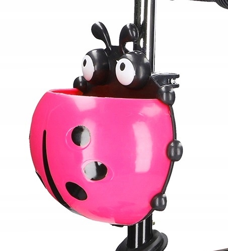 Z przodu hulajnogi umieszczony jest koszyczek w kształcie biedronki na drobne dziecięce drobiazgi.