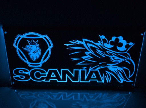 Grawerowana i podświetlana tablica z logo Scania do ciężarówki, nad łóżko zasilana napięciem 24V na mikrowtyk. 60x30cm.