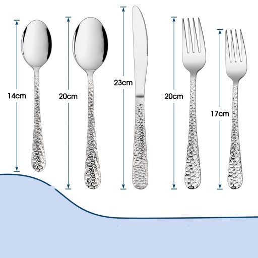 - 🍴Rozmiar: Nóż - 23cm, Widelec - 20cm, Łyżka - 20cm, Łyżeczka - 13,5cm, Widelec do sałatek - 17cm