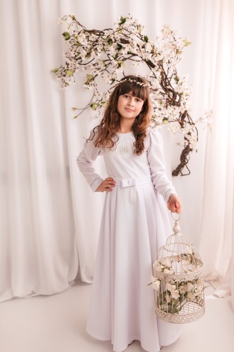 Na Pierwszą Komunie Świętą, z pewnością poszukiwany jest idealny strój komunijny, tak aby dziewczynka poczuła się jak prawdziwa księżniczka. Idealną propozycją jest alba komunijna dla dziewczynki, która wyróżnia się niezwykle dopasowanym krojem. Fason rozkloszowany, z długim rękawem. W pasie pasek z kokardką. Na piersi haft srebrny IHS. Dodatkowo można dokupić Pelerynkę- narzutkę. Alba szyta na indywidualne zamówienie, można podać wymiary dziewczynki.
